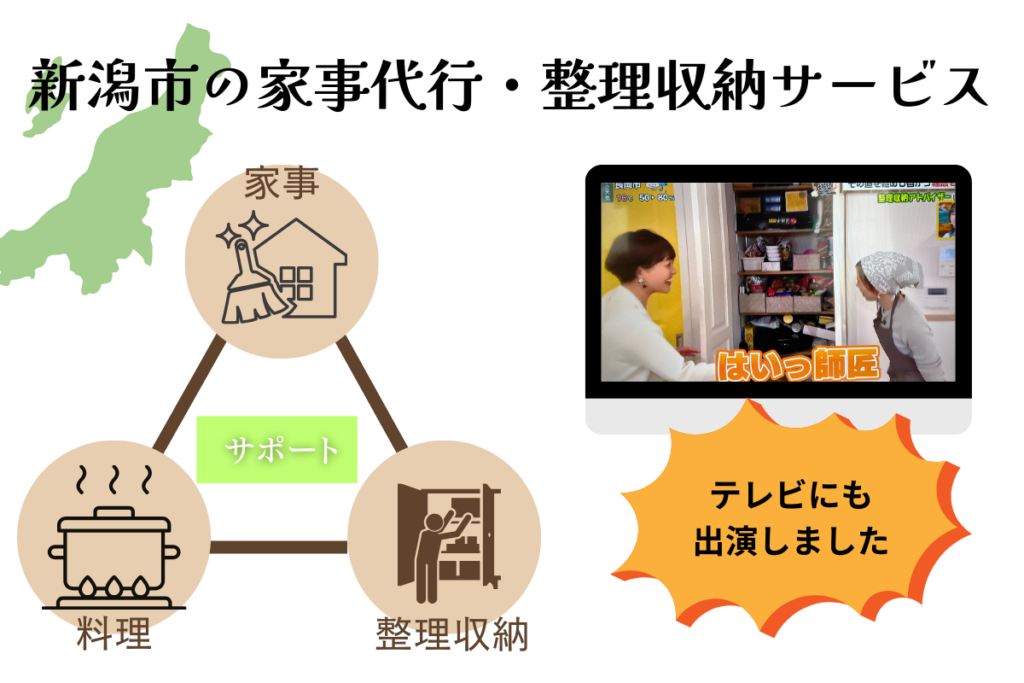 家事、掃除、料理、整理収納を新潟市で実務経験を積んだスタッフ、子育てや家庭を支えてきた経験を持つスタッフによる、安心して任せられる家事サポートを行っています。